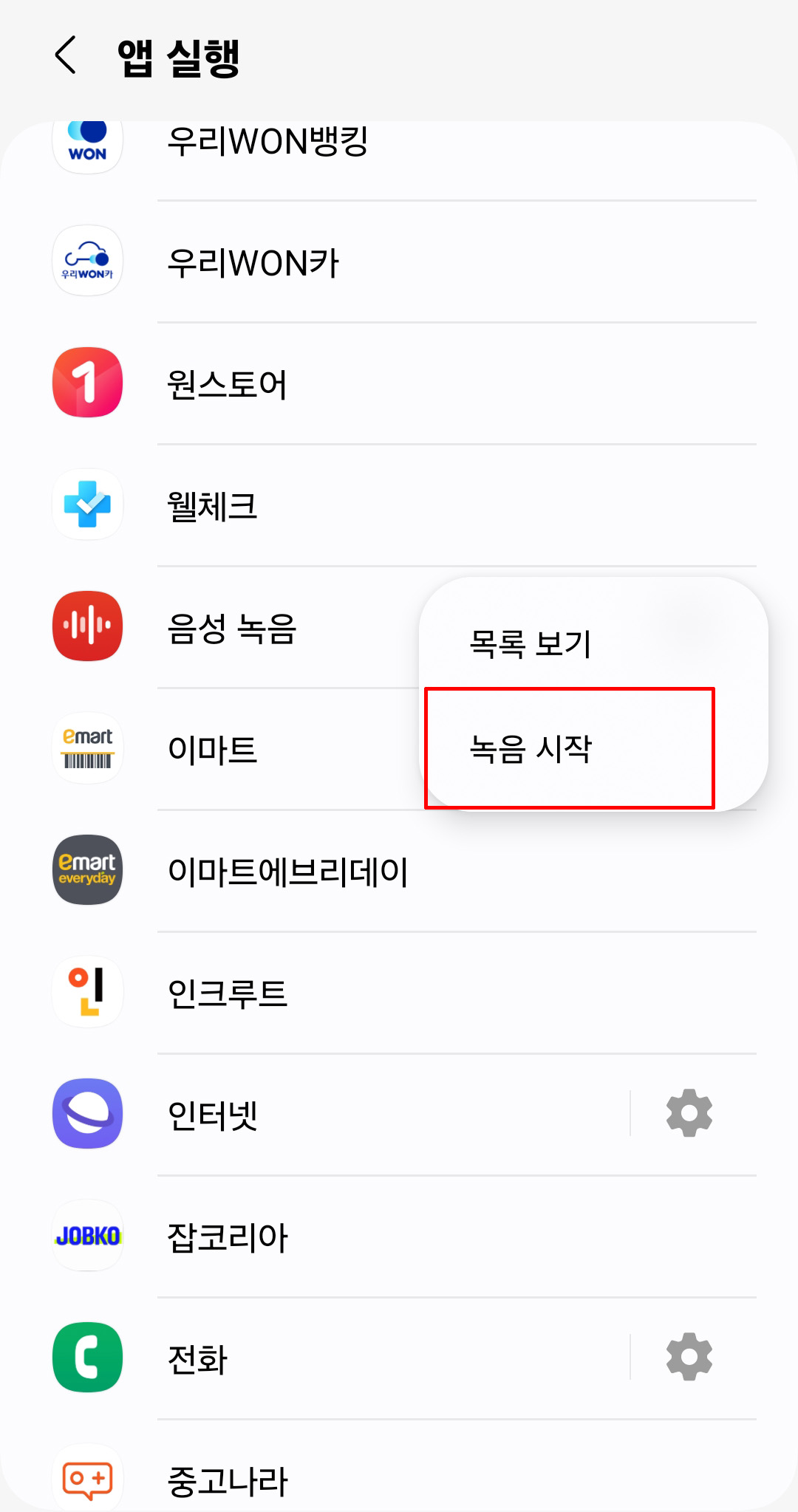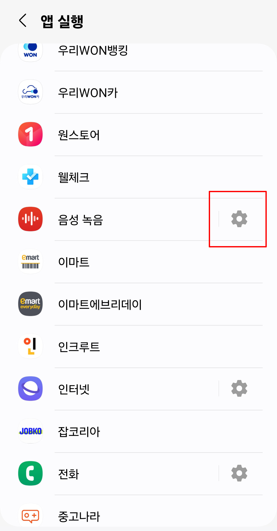 • 화면을 내리면서 음성녹음을 찾아주시고 오른쪽 톱니바퀴를 눌러줍니다.