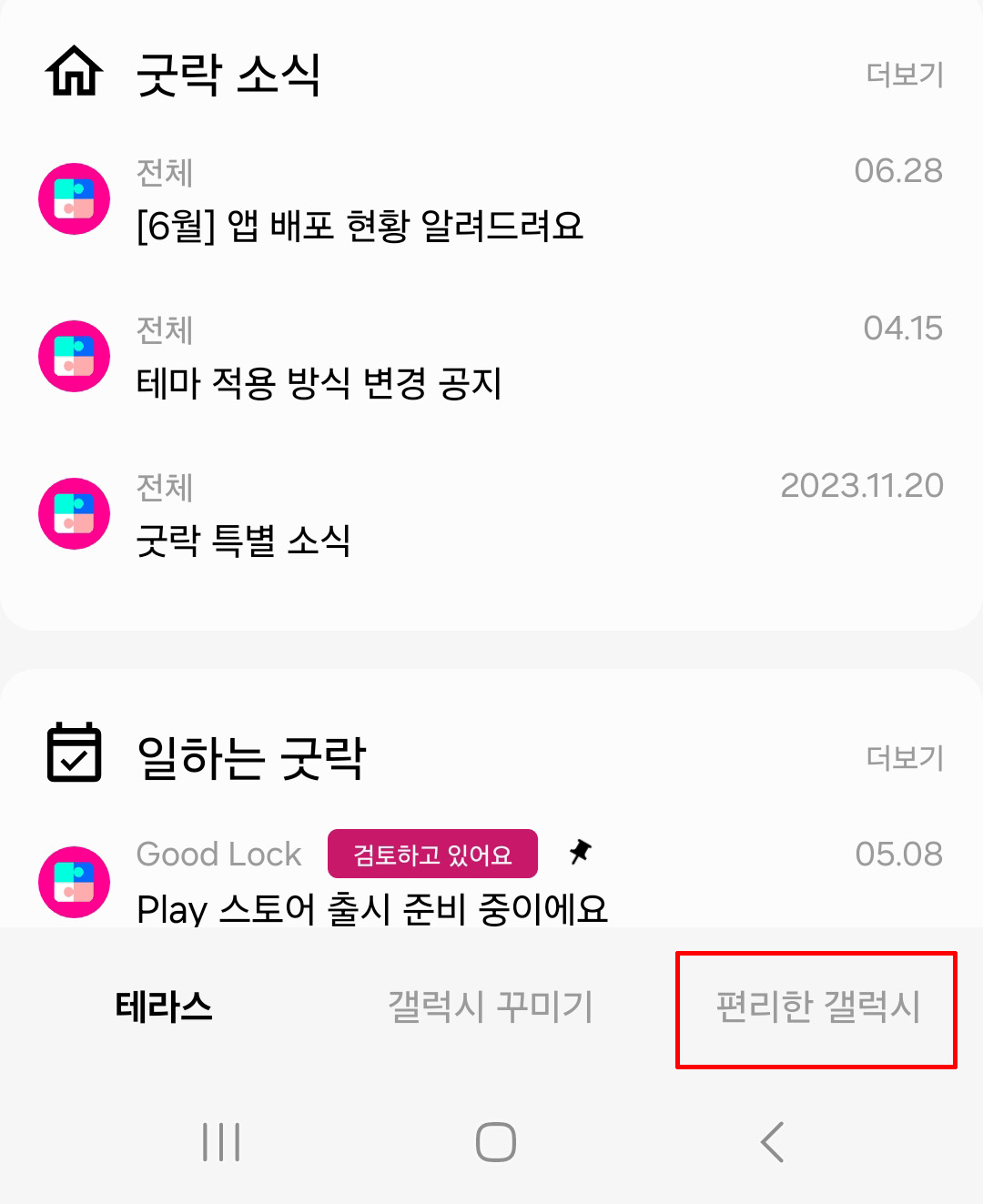 • 굳락을 실행하시면 오른쪽 밑에 '편리한 갤럭시'를 클릭합니다.