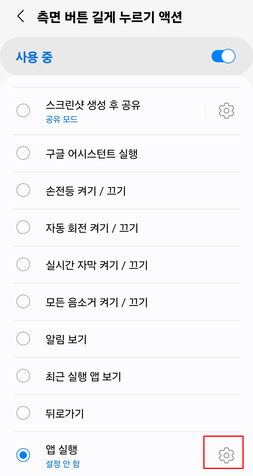 • 화면을 아래로 내려보면 앱실행이 있습니다. 여기서 톱니바퀴를 눌러서 들어가세요.